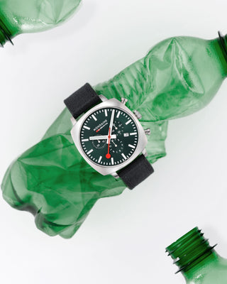 For decades, we've collected and recycled materials like paper, cardboard, plastics, and watch components, ensuring that nothing goes to waste. As part of this philosophy, we also offer free watch recycling in our factory in Switzerland, where we dismantle them and send the parts to recycling firms. Even watches from other brands are welcome, except for their plastic ones.