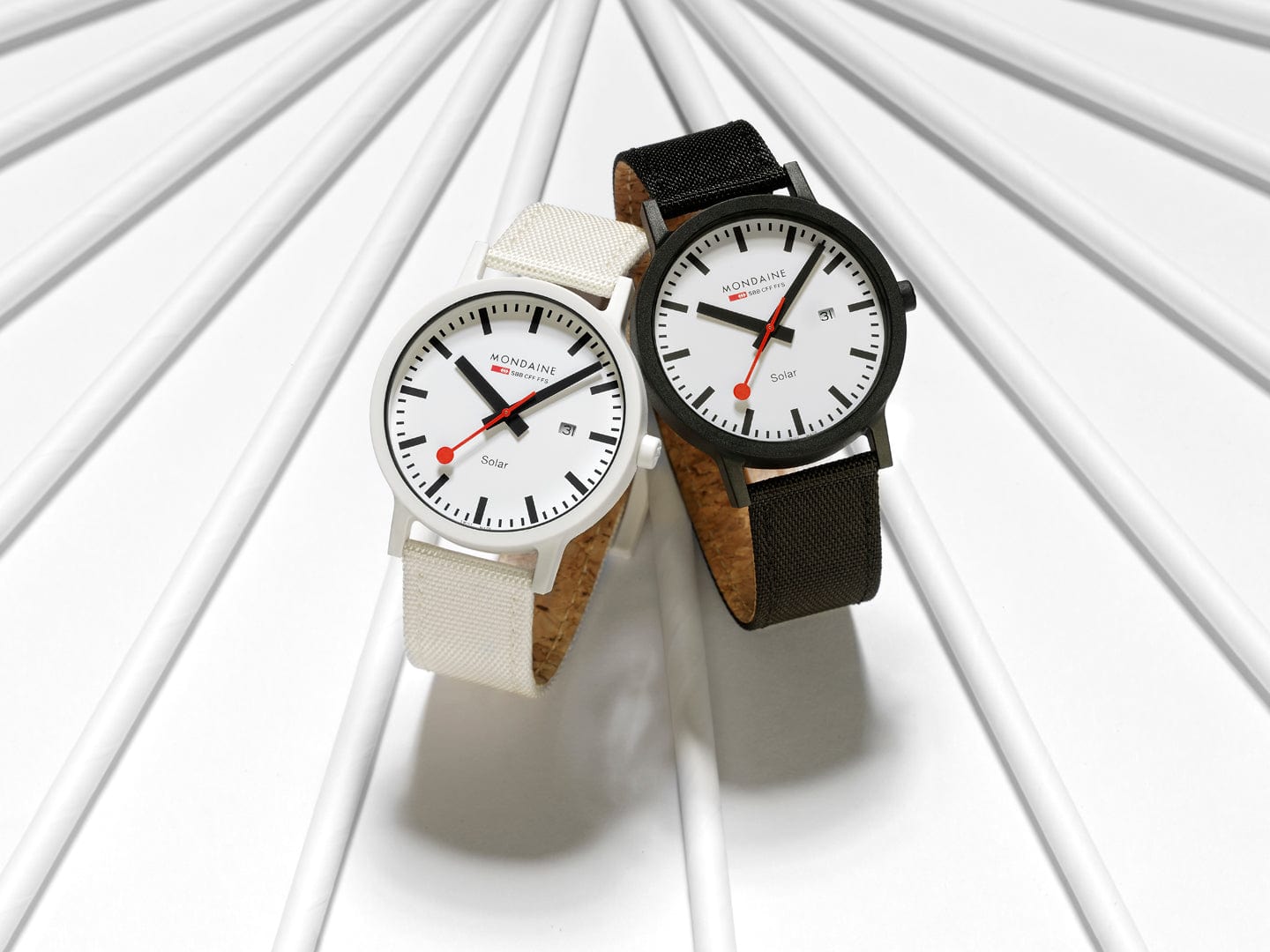 Powered entirely by light, the Mondaine essence solar combines iconic Swiss design with modern sustainability. At its heart beats a Swiss Made Ronda solar movement, charging through any light source and running for up to 8 months even in complete darkness once fully charged. The 41mm case is crafted from a renewable castor oil composite, while the strap is made from recycled PET textile with a natural cork lining for comfort. With its crisp white dial, bold black markers, and the signature red seconds hand, this timepiece is both timeless and forward-thinking — designed to last, responsibly.