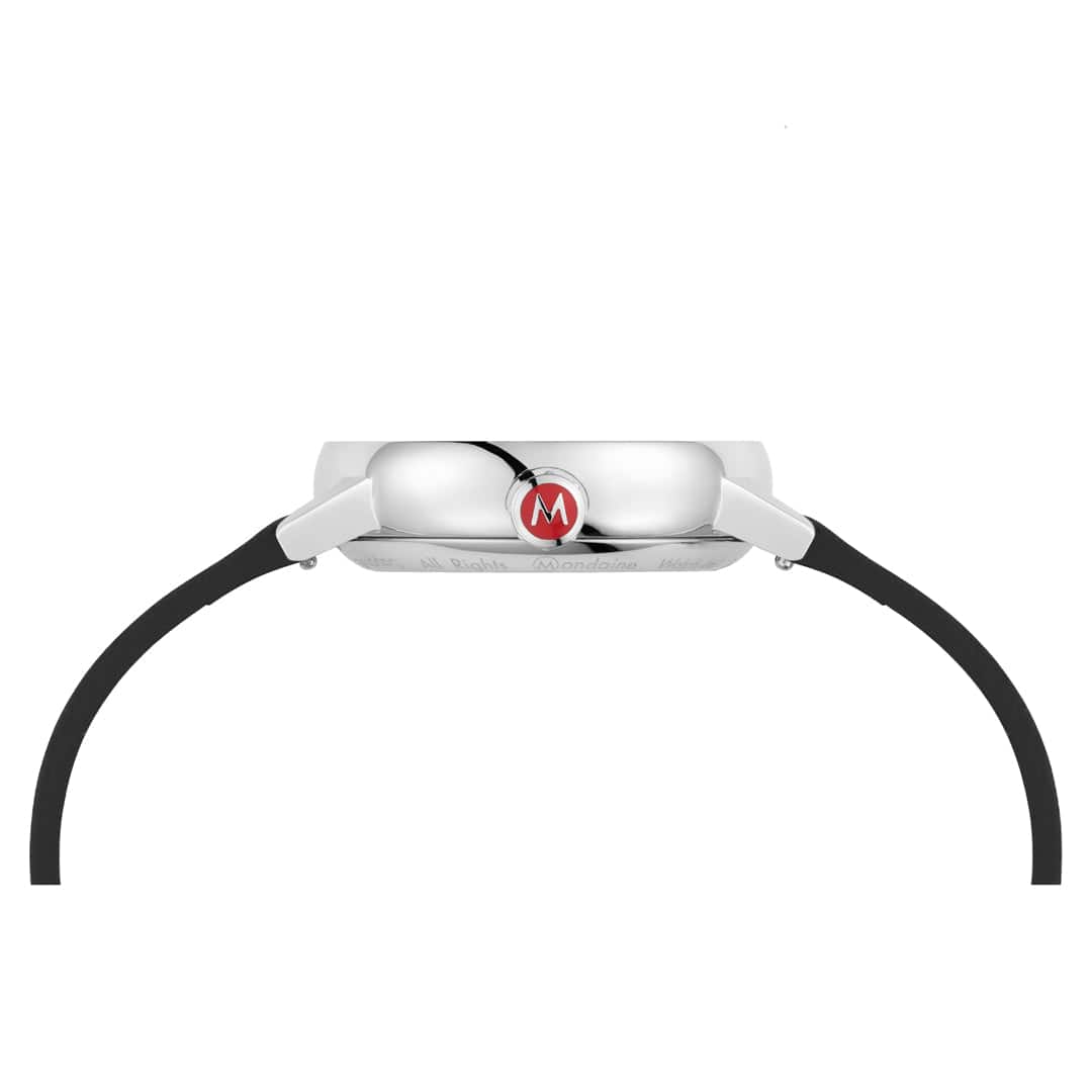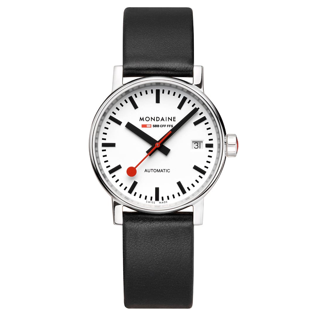The Evo2 Automatic watch is housed in our legendary evo2 case creating a harmonious, fluid design. The rounded, organic shape of the 40mm diameter polished stainless steel case adds to the comfortable wear of this timepiece. A true design highlight is the see-through case back allowing you to see how the complex automatic movement works. The iconic Mondaine dial with date indication and the black vegan strap add the finishing touches. The watch has a vegan grape leather strap in black which consists of 75% eco-friendly plant-based composite material and 25% recycled PET.