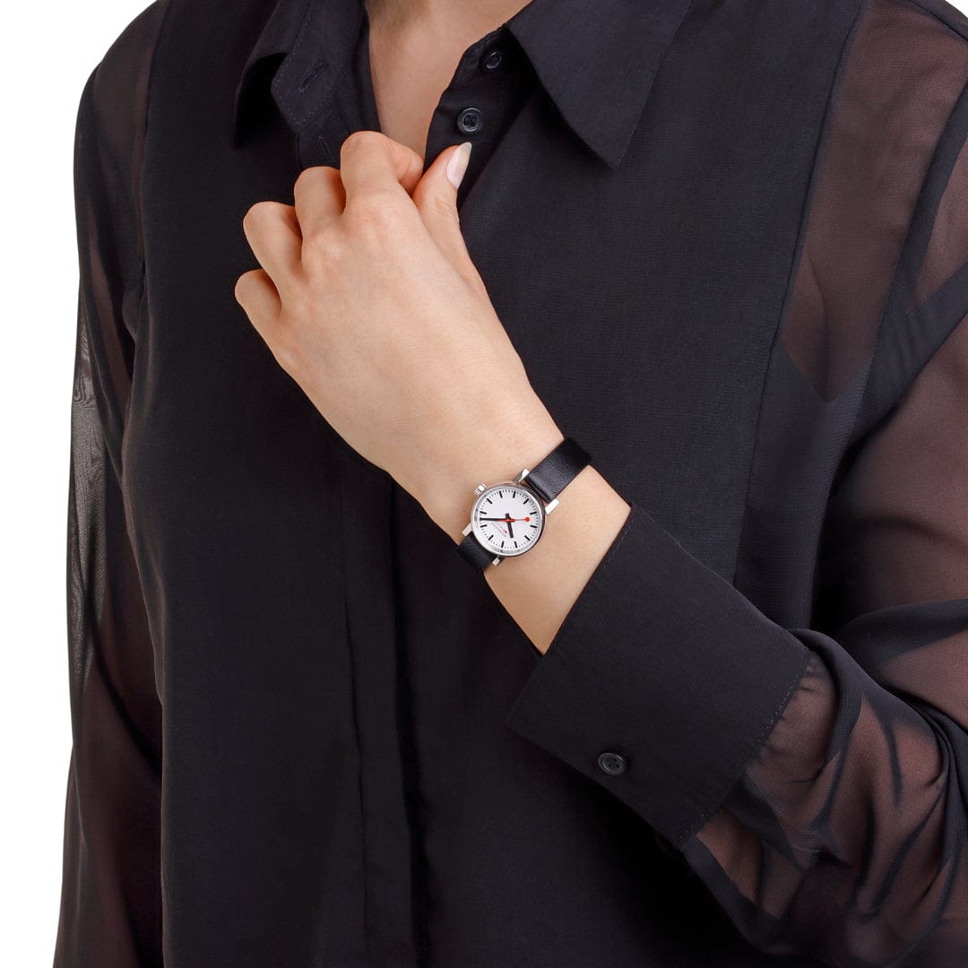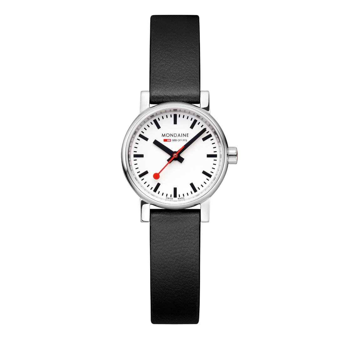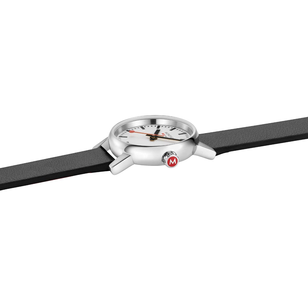 With its harmoniously designed polished stainless steel case and 26mm diameter, this Mondaine evo2 is a watch for small delicate wrists and is very comfortable to wear. The sapphire crystal protects the iconic dial with the prominent red second hand. Thanks to its minimalistic design the watch is highly readable. The ergonomic red crown and the red vegan strap highlight Mondaine's expertise. The watch has a vegan grape leather strap in red which consists of 75% eco-friendly plant-based composite material and 25% recycled PET.