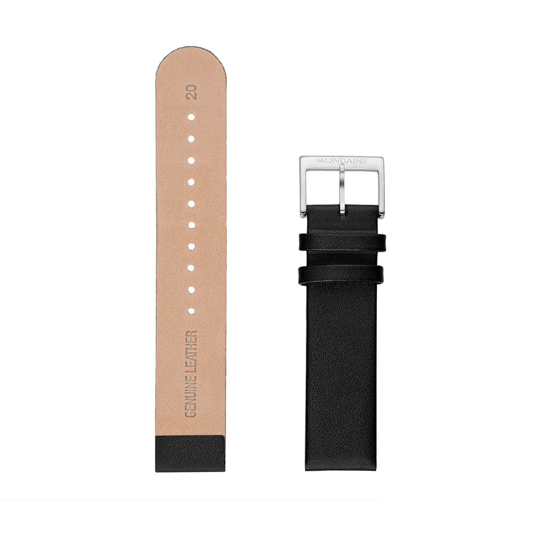 Vegan Leather Watch Strap, 20mm, Black, Brushed Steel