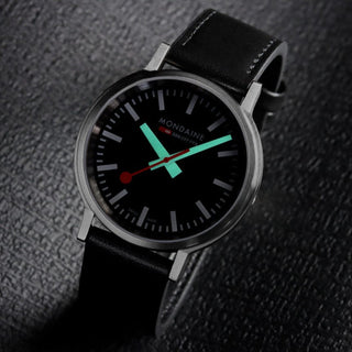 Using proprietary tech, Mondaine has innovatively installed Super-LumiNova® on the back side of the hour and minute hands that allows the wearer to keep time in any lighting condition.